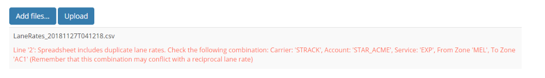 Each import spreadsheet must have one line per Carrier, Account, Service, From Zone, To Zone combination (or lane). Please note that MachShip will check the rates which are reciprocal as well and ensure that there are not multiple rates for the same lane.