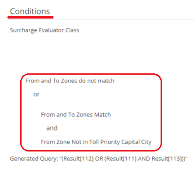 To see if a surcharge has a query linked to it please edit the charge. The query will be shown in the Conditions section like the below: