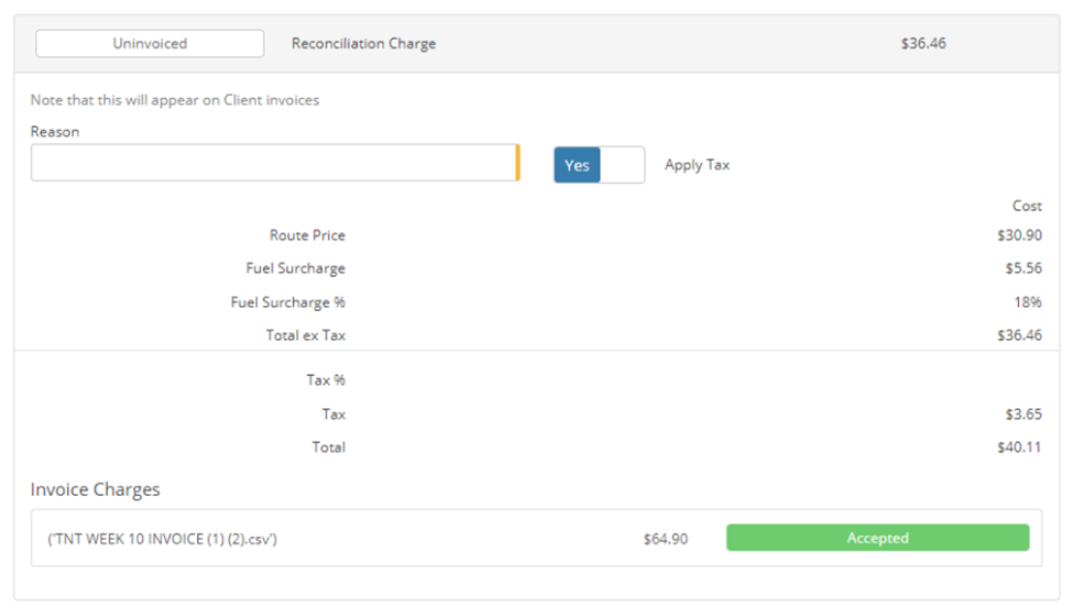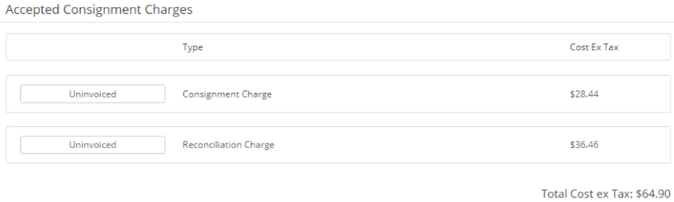 The Consignment Charge will be the component of the invoice charge which equals the MachShip quote. The Reconciliation Charge will equate to the accepted charge discrepancy amount.