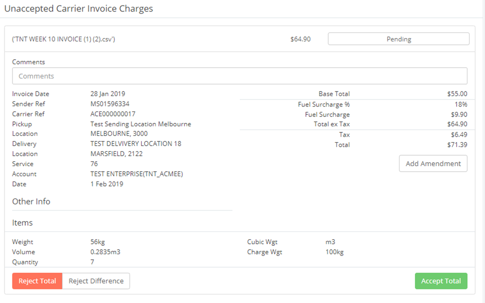 When there is a charge discrepancy based on the upload of a carrier invoice, users will have the option to: