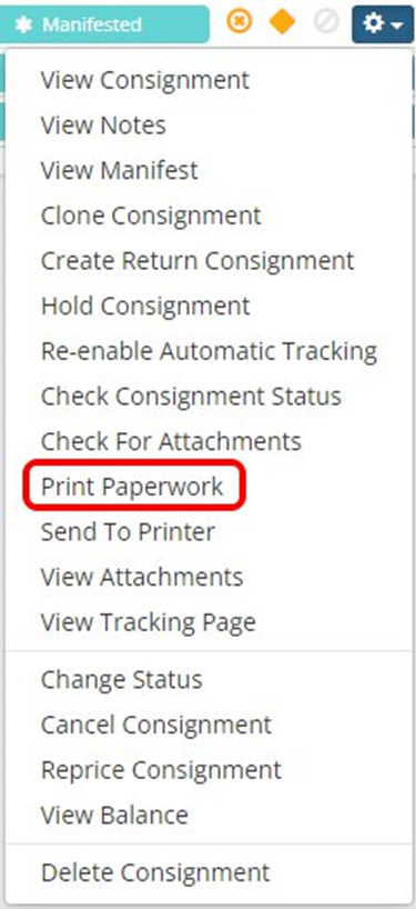 - On the All Consignment screen, the consignment with the Diamond Icon, click on the cog-wheel on the right-hand side and select Print Paperwork.