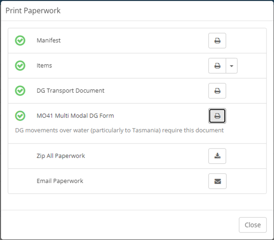 Clicking on the printer icon aligned with DG Transport Document or MO41 Multimodal DG Form will download only the document on a PDF file: