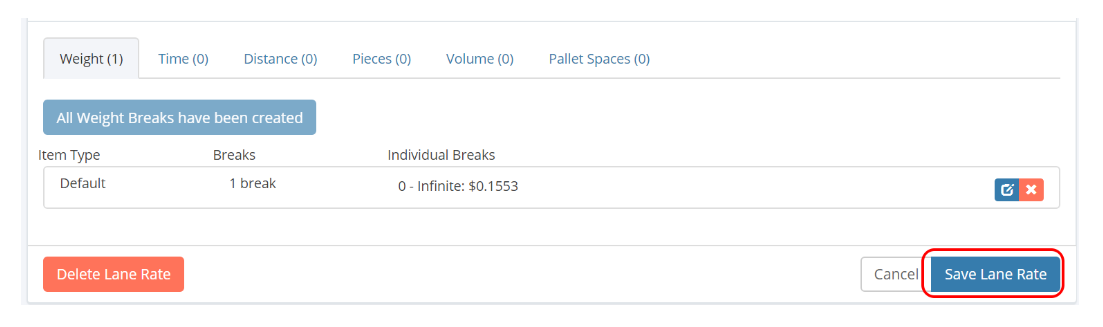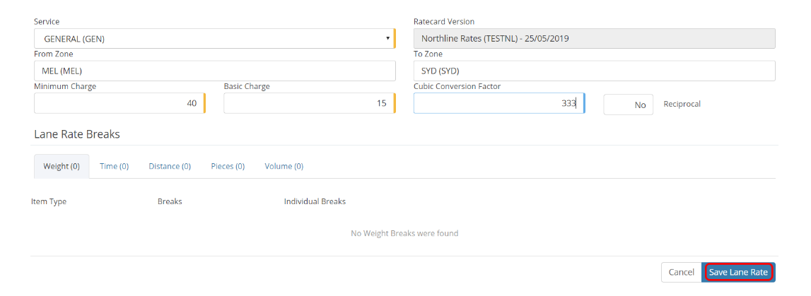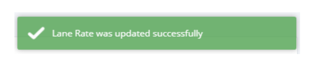 A green Lane Rate was updated successfully prompt will show in the top right corner of the screen if successful.