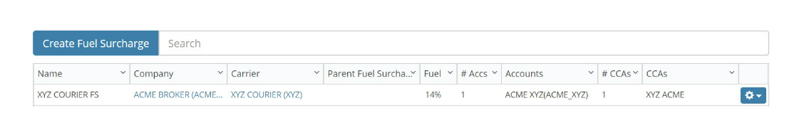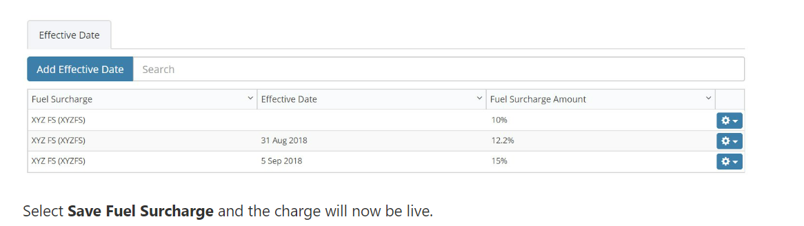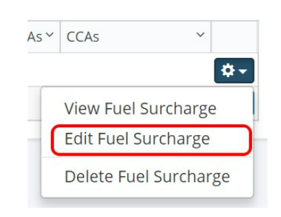 Once you have found the fuel surcharge/s you wish to update, utilise the cog on the left-hand side of the grid and select Edit Fuel Surcharge: