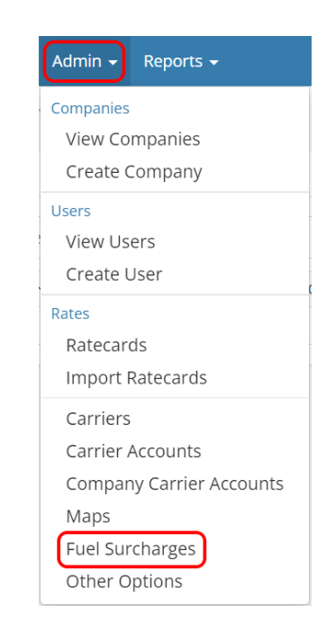 Fuel surcharges are located in their own section within the administration menu of the MachShip system. See the highlighted fields below on how to navigate to this section.