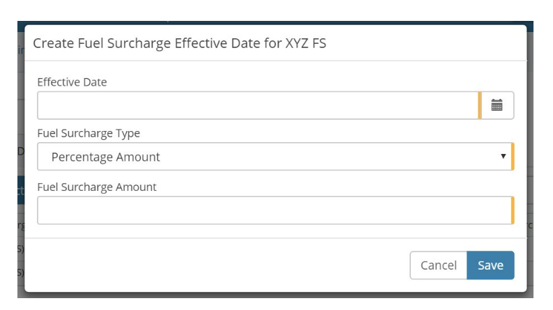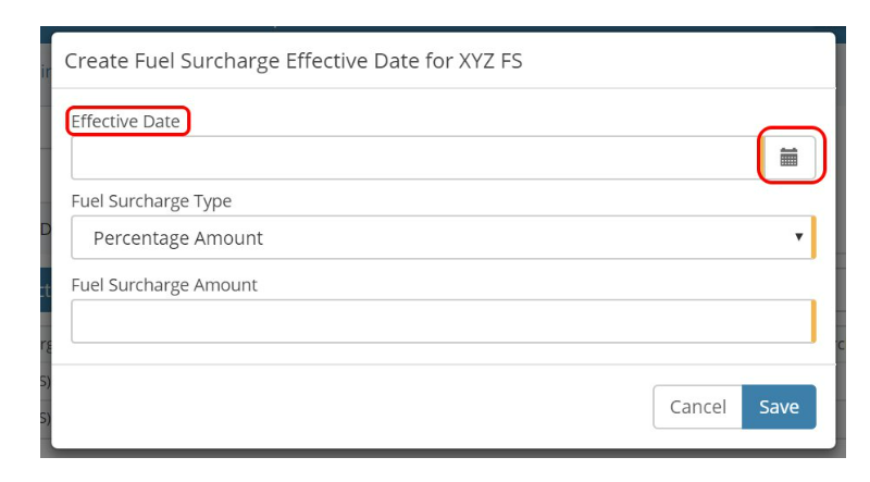 Set the date for which the fuel surcharge should take effect in the Effective Date field. Clicking the calendar will bring up the date selector.