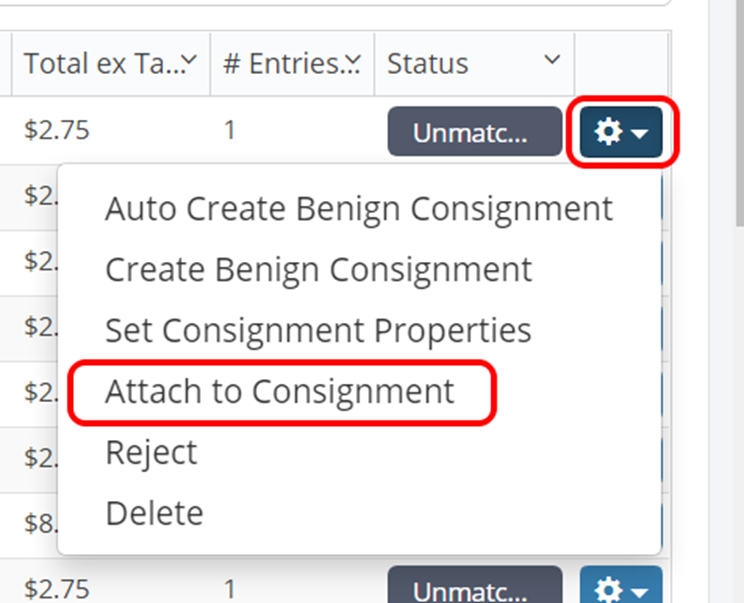 To manually assign the entry, click on the Cog and click on Attach to Consignments.