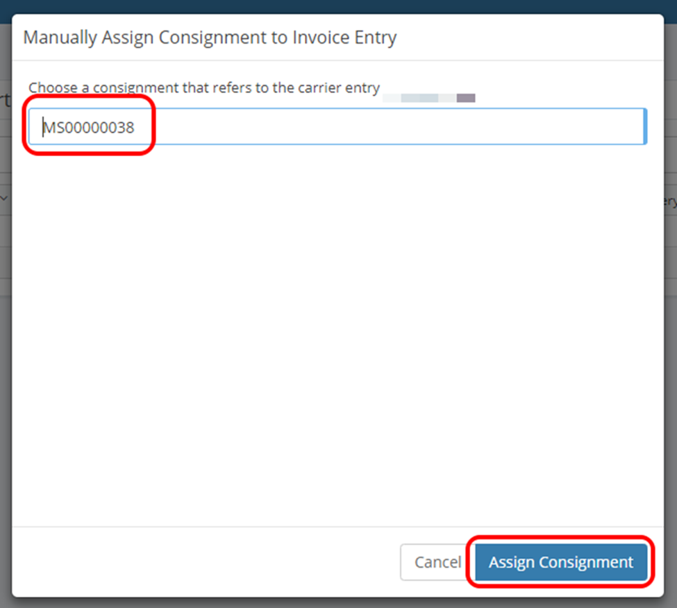 A Manually Assign Consignment to Invoice Entry prompt will come up.
