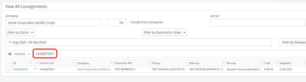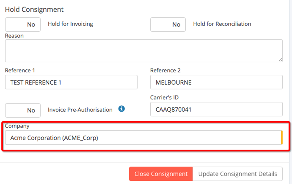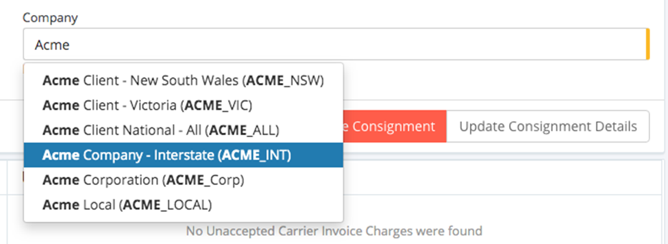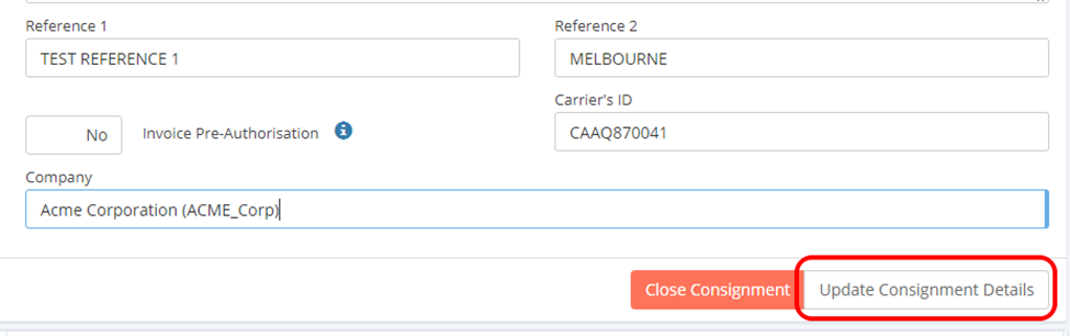Once you have selected the company, you will then click the "Update Consignment Details".