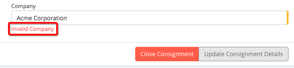 If you will just manually type in the company and won't select from the drop-down, it will show an error that the company is Invalid and you will not be able to update the consignment.
