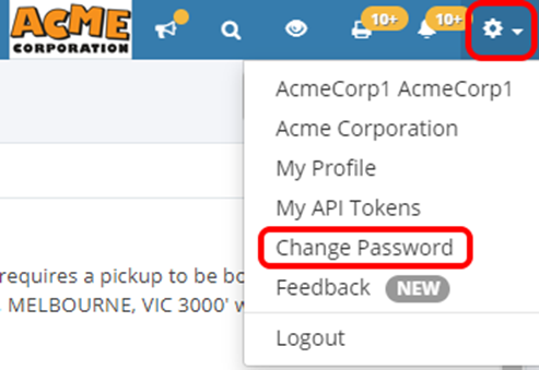 Select the drop-down cog in the top right-hand corner of the page. From this drop-down select Change Password.