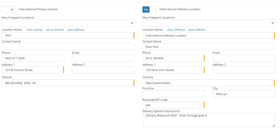 2. Fill out any missing data in the Pickup or Delivery input section - noting you can only have one of the addresses set as International
