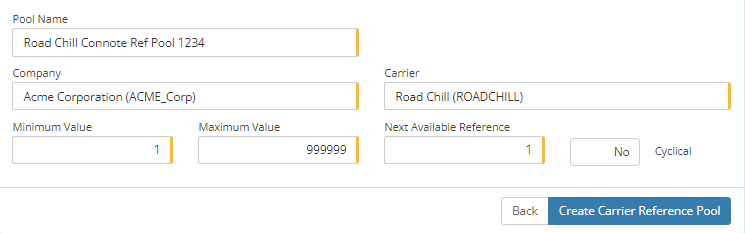 Reference Pools - Reference pools are utilised by MachShip in order to maintain a count on connotes, manifests, and item numbers. The reference pool will ensure that each of those numbers is unique to what we have sent to the carrier previously. More information can be obtained on reference pools here. Road Chill requires the creation of just 1 reference pool, for the Connote number.