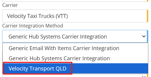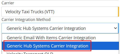 When looking to set up a new account with Velocity Taxi Trucks you will need to set the correct integration method when creating the carrier account. If you are setting up your VIC account, you need to set the integration method to Generic Hub System Carrier Integration: