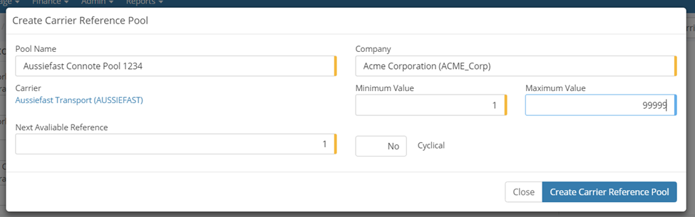 Reference Pools - Reference pools are utilised by MachShip in order to maintain a count on connote, manifest and item numbers. The reference pool will ensure that each of those numbers is unique to what we have sent to the carrier previously. More information can be obtained on reference pools here. Aussiefast requires the creation of just 1 reference pool, for the Connote number.