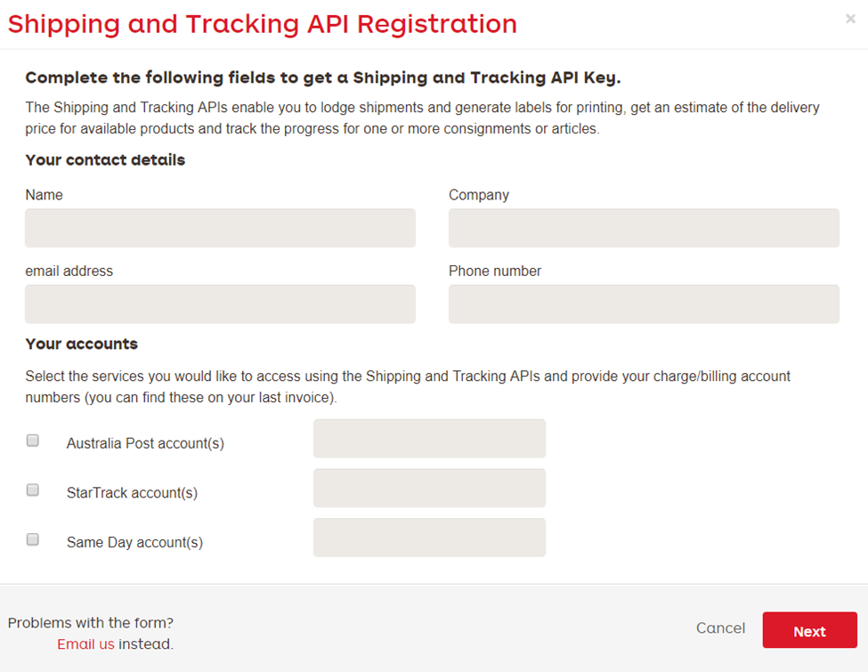 You will need to sign up for the Australia Post developers centre and fill out the below registration form. Please ensure you are signing up for a Shipping and Tracking API key.