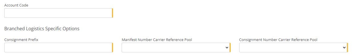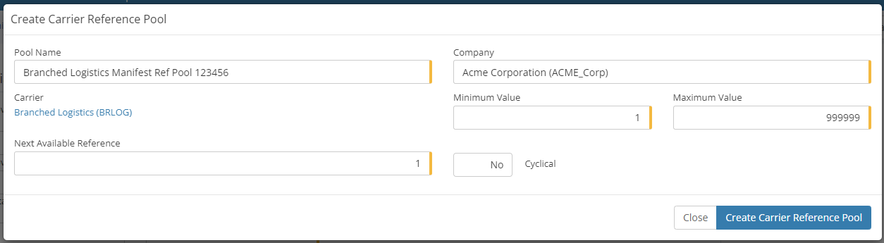 Branched Logistics requires the creation of 2 reference pools, for the Connote number and Manifest number.To create the reference pool select the Create Carrier Reference Pool button at the bottom of the page.