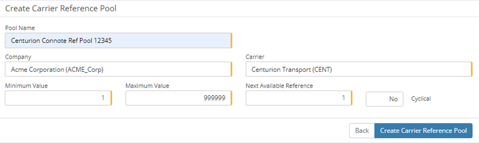 Reference Pools - Reference pools are utilised by MachShip in order to maintain a count on connotes, manifests and item numbers. The reference pool will ensure that each of those numbers is unique to what we have sent to the carrier previously. More information can be obtained on reference pools here. Centurion Transport requires the creation of just 1 reference pool, for the Connote number.