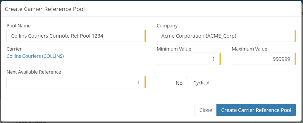 Reference Pools - Reference pools are utilised by MachShip in order to maintain a count on connotes, manifests and item numbers. The reference pool will ensure that each of those numbers is unique to what we have sent to the carrier previously. More information can be obtained on reference pools here. Collins Couriers requires the creation of just 1 reference pool, for the Connote number.