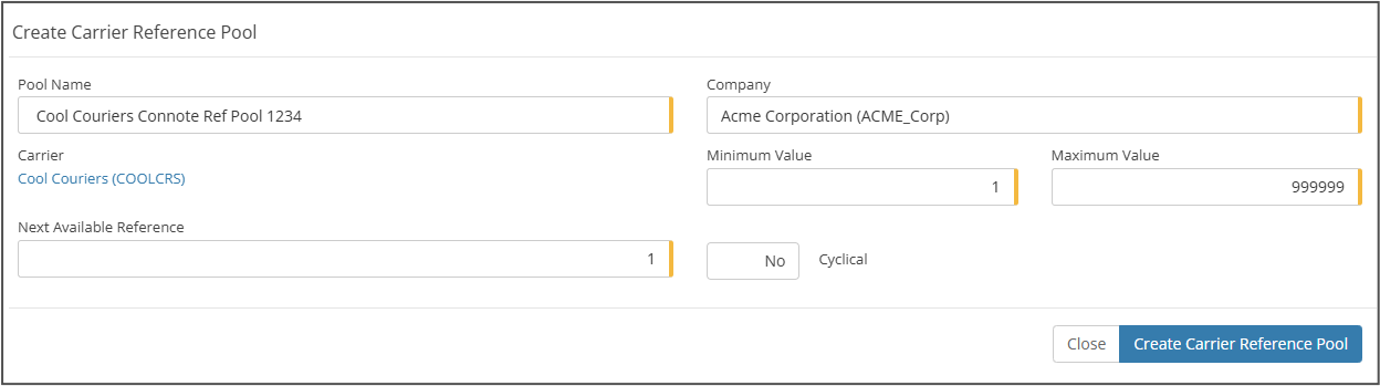 Reference Pools - Reference pools are utilised by MachShip in order to maintain a count on connotes, manifests and item numbers. The reference pool will ensure that each of those numbers is unique to what we have sent to the carrier previously. More information can be obtained on reference pools here. Cool Couriers requires the creation of just 1 reference pool, for the Connote number.