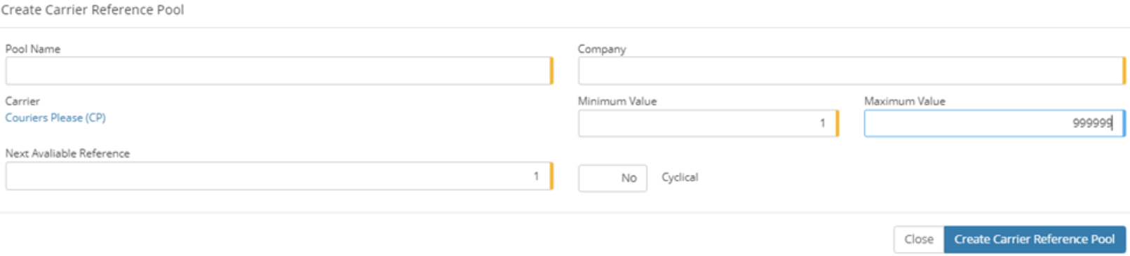 Reference Pools - MachShip utilises reference pools to maintain a count on connote, manifest and item numbers. The reference pool will ensure that each of those numbers is unique to what we have sent to the carrier previously. More information can be obtained on reference pools here. Couriers Please requires the creation of 2 reference pools, for the Connote number and Item Number