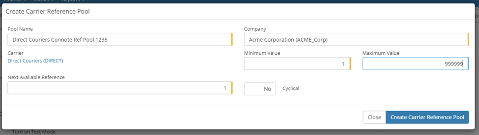 Reference Pools - Reference pools are utilised by MachShip in order to maintain a count on the connote, manifest and item numbers. The reference pool will ensure that each of those numbers is unique to what we have sent to the carrier previously. More information can be obtained on reference pools here. Direct Couriers requires the creation of just 1 reference pool, for the Connote number.