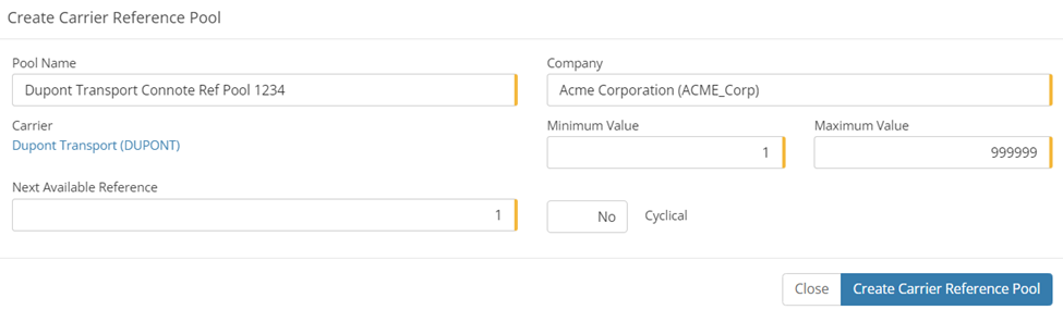 Reference Pools - Reference pools are utilised by MachShip in order to maintain a count on connotes, manifests and item numbers. The reference pool will ensure that each of those numbers is unique to what we have sent to the carrier previously. More information can be obtained on reference pools here. Dupont Transport requires the creation of just 1 reference pool, for the Connote number.