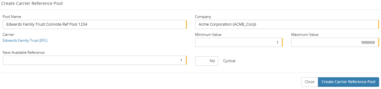 Reference Pools - Reference pools are utilised by MachShip in order to maintain a count on connotes, manifests and item numbers. The reference pool will ensure that each of those numbers is unique to what we have sent to the carrier previously. More information can be obtained on reference pools here. Edwards Family Trust requires the creation of just 1 reference pool, for the Connote number.