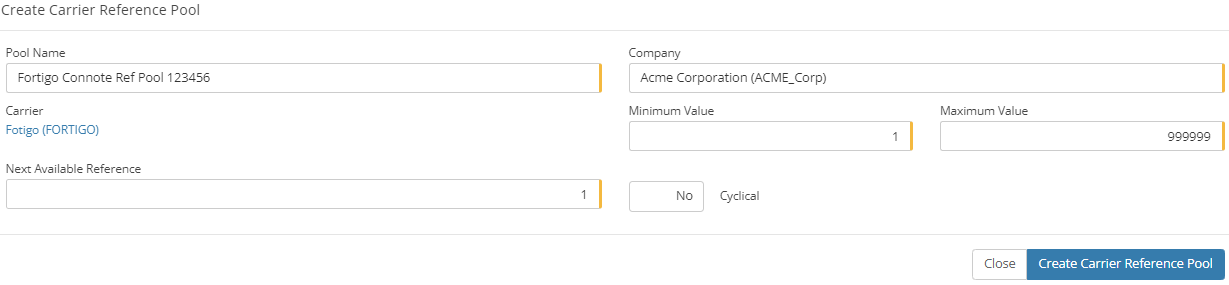 Reference Pools - Reference pools are utilised by MachShip in order to maintain a count on connotes, manifests, and item numbers. The reference pool will ensure that each of those numbers is unique to what we have sent to the carrier previously. More information can be obtained on reference pools here. Fortigo requires the creation of just 1 reference pool, for the Connote number.