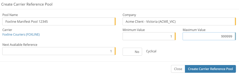 Reference Pools - Reference pools are utilised by MachShip in order to maintain a count on connote, manifest and item numbers. The reference pool will ensure that each of those numbers is unique to what we have sent to the carrier previously. More information can be obtained on reference pools here. Foxline Couriers requires the creation of 1 reference pool, for the Manifest.