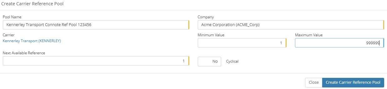 Reference Pools - Reference pools are utilised by MachShip in order to maintain a count on connotes, manifests, and item numbers. The reference pool will ensure that each of those numbers is unique to what we have sent to the carrier previously. More information can be obtained on reference pools here. Kennerley Transport requires the creation of just 1 reference pool, for the Connote number.