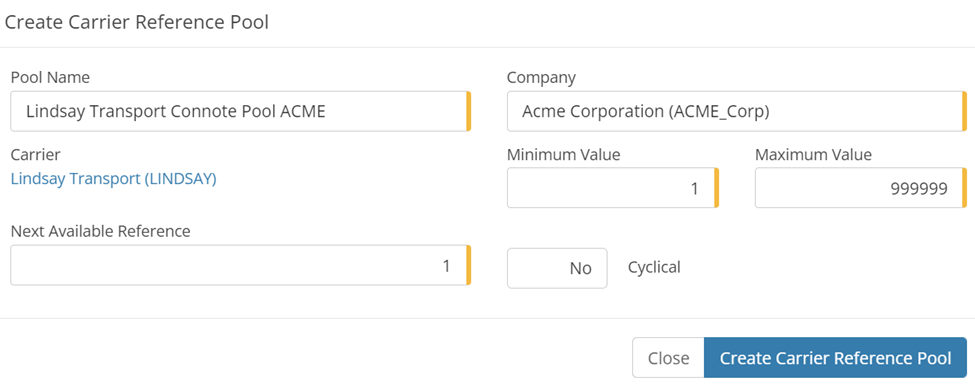 Reference Pools - Reference pools are utilised by MachShip in order to maintain a count on connotes, manifests and item numbers. The reference pool will ensure that each of those numbers is unique to what we have sent to the carrier previously. More information can be obtained on reference pools here. Lindsay Transport requires the creation of just 1 reference pool, for the Connote number.