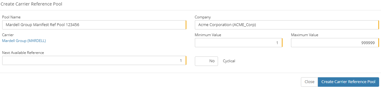 Mardell Group requires the creation of 2 reference pools, for the Connote number and Manifest number.To create the reference pool select the Create Carrier Reference Pool button at the bottom of the page.
