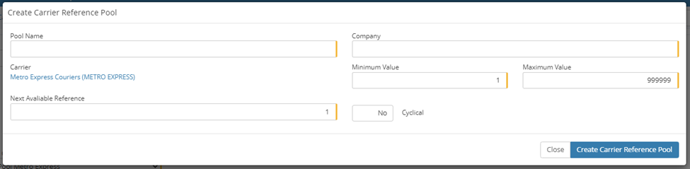 Reference Pools - Reference pools are utilised by MachShip in order to maintain a count on the connote, manifest and item numbers. The reference pool will ensure that each of those numbers is unique to what we have sent to the carrier previously. More information can be obtained on reference pools here. Metro Express Transport Group require the creation of 2 reference pools, for the Connote Number and the Manifest number.