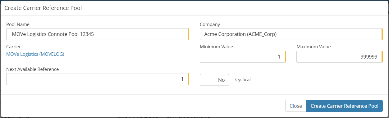 Pool Name - Set one as MOVe Logistics Connote Pool <Account Code>