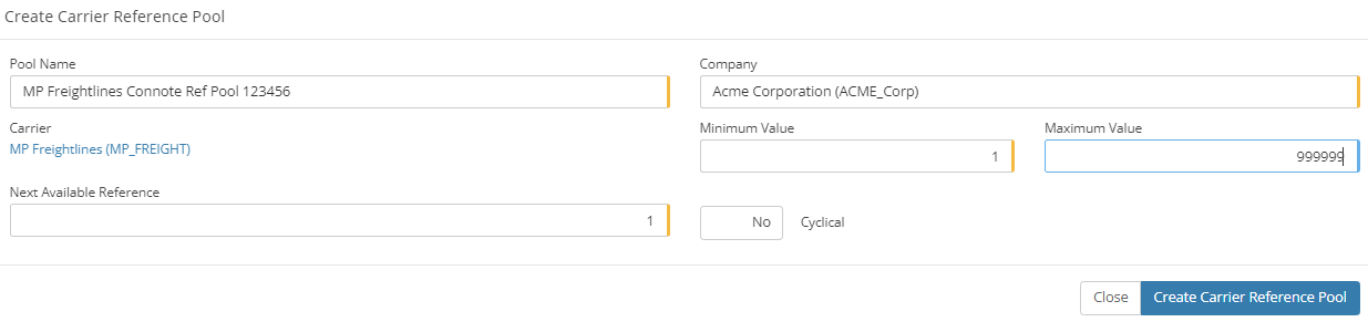 Reference Pools - Reference pools are utilised by MachShip in order to maintain a count on connotes, manifests, and item numbers. The reference pool will ensure that each of those numbers is unique to what we have sent to the carrier previously. More information can be obtained on reference pools here. MP Freightlines requires the creation of just 1 reference pool, for the Connote number.
