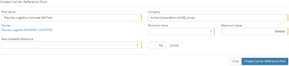Reference Pools - Reference pools are utilised by MachShip in order to maintain a count on connotes, manifests, and item numbers. The reference pool will ensure that each of those numbers is unique to what we have sent to the carrier previously. More information can be obtained on reference pools here. Fleurieu Logistics requires the creation of just 1 reference pool, for the Connote number.