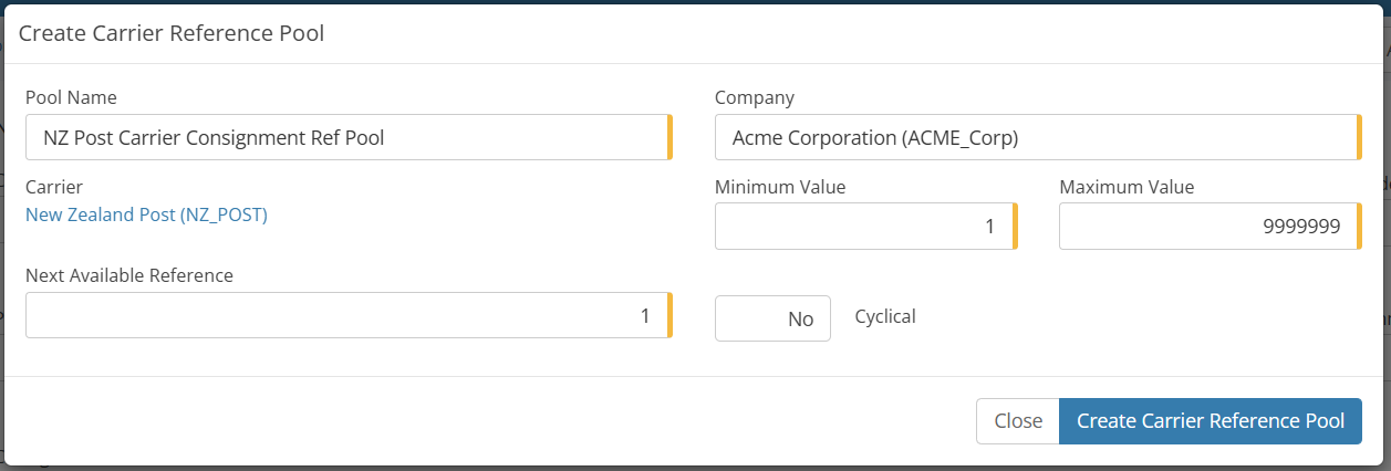 Reference Pools - Reference pools are utilised by MachShip to maintain a count on connotes, manifests and item numbers. The reference pool will ensure that each of those numbers is unique from what we have sent to the carrier previously. More information can be obtained on reference pools here. NZ Post requires the creation of just 1 reference pool for the Connote number.