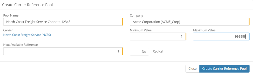 Reference Pools - Reference pools are utilised by MachShip in order to maintain a count on connotes, manifests and item numbers. The reference pool will ensure that each of those numbers is unique to what we have sent to the carrier previously. More information can be obtained on reference pools here. North Coast Freight Service requires the creation of just 1 reference pool, for the Connote number.