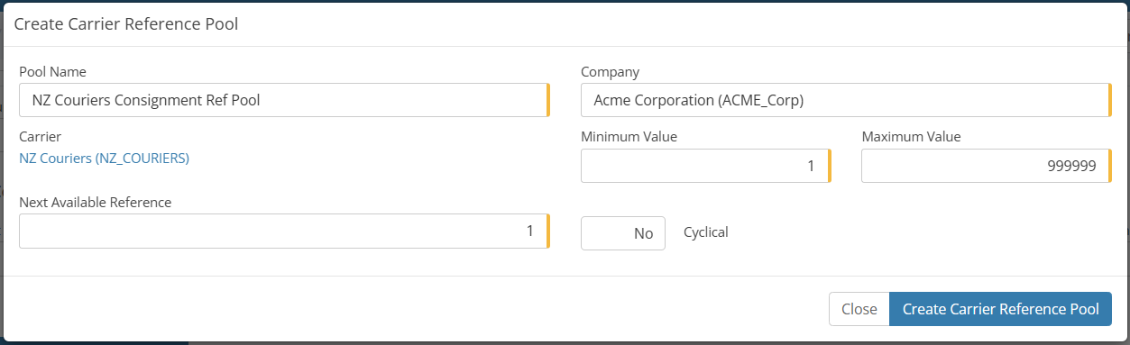 Reference Pools - Reference pools are utilised by MachShip to maintain a count on connotes, manifests and item numbers. The reference pool will ensure that each of those numbers is unique from what we have sent to the carrier previously. More information can be obtained on reference pools here. NZ Couriers requires the creation of just 1 reference pool for the Connote number.