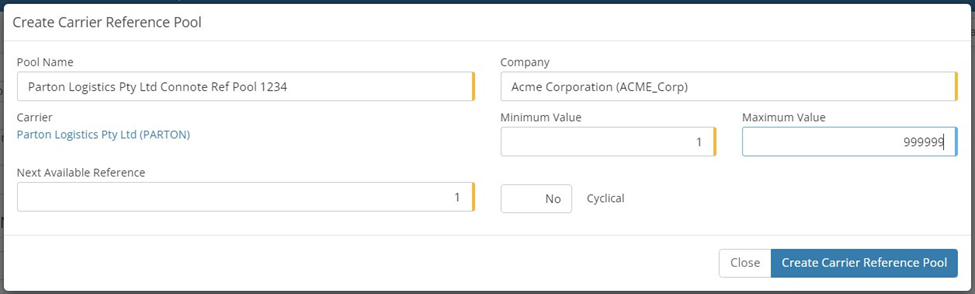 Reference Pools - Reference pools are utilised by MachShip in order to maintain a count on connotes, manifests, and item numbers. The reference pool will ensure that each of those numbers is unique to what we have sent to the carrier previously. More information can be obtained on reference pools here. Parton Logistics Pty Ltd requires the creation of just 1 reference pool, for the Connote number.