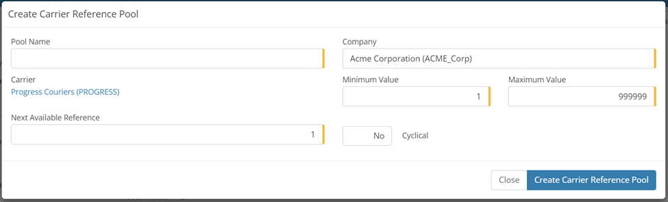 Reference Pools - Reference pools are utilised by MachShip in order to maintain a count on connote, manifest, and item numbers. The reference pool will ensure that each of those numbers is unique to what we have sent to the carrier previously. More information can be obtained on reference pools here. Progress Couriers requires the creation of just 1 reference pool, for the Manifest number.