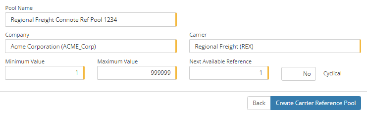 Reference Pools - Reference pools are utilised by MachShip in order to maintain a count on connotes, manifests, and item numbers. The reference pool will ensure that each of those numbers is unique to what we have sent to the carrier previously. More information can be obtained on reference pools here. Regional Freight requires the creation of just 1 reference pool, for the Connote number.