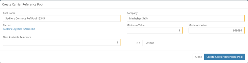 Reference Pools - Reference pools are utilised by MachShip in order to maintain a count on connotes, manifests, and item numbers. The reference pool will ensure that each of those numbers is unique to what we have sent to the carrier previously. More information can be obtained on reference pools here. Active requires the creation of just 1 reference pool, for the Connote number.