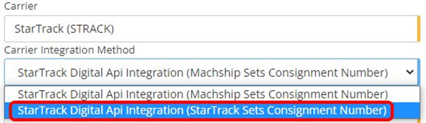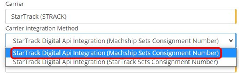 If you are going to utilise this integration, you will need to select the StarTrack Digital Api Integration (MachShip Sets Consignment Number) from the dropdown
