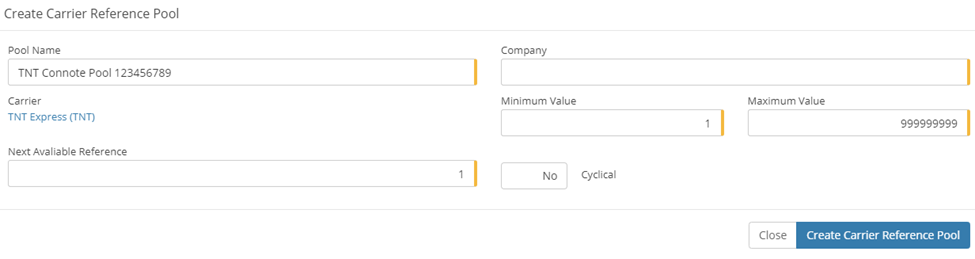 Reference Pools - Reference pools are utilised by MachShip in order to maintain a count on connote, manifest and item numbers. The reference pool will ensure that each of those numbers is unique to what we have sent to the carrier previously. More information can be obtained on reference pools here. TNT requires the creation of just 1 reference pool, for the Connote number.