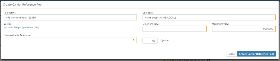 Reference Pools - Reference pools are utilized by MachShip in order to maintain a count on connote, manifest and item numbers. The reference pool will ensure that each of those numbers is unique to what we have sent to the carrier previously. More information can be obtained on reference pools here. As above VFS requires the creation of 1 reference pools one for the Connote number.