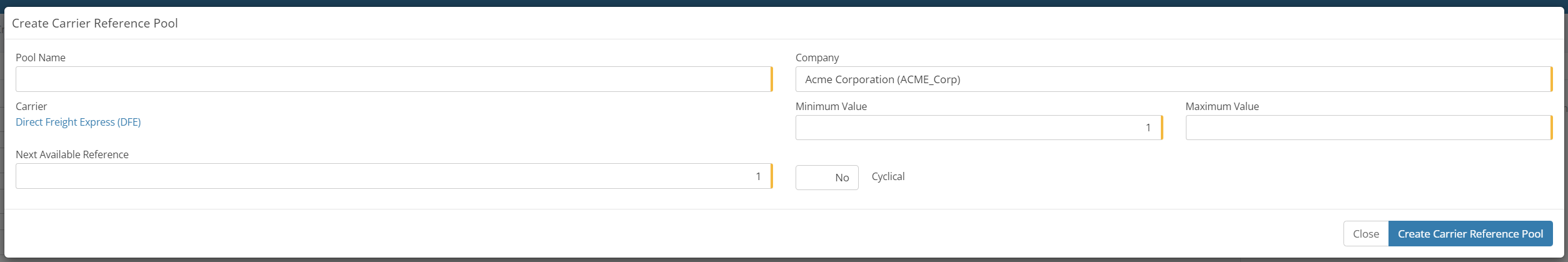 This will prompt the create Carrier Reference Pool screen and the user will need to provide: