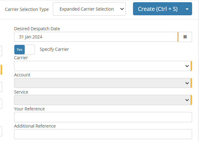- Carrier Selection - The carrier selection method on the Quick Consignment page is Long carrier selection, Short carrier selection or Route Options carrier selection. The long carrier selection will require a user to select the carrier, account, and service from three dropdowns on the Quick Consignment page. This will be best used when there are a large number of carrier and service options.