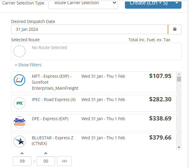 The Route Carrier Selection will provide the user with pricing information as they populate the consignment information on the Quick Consignment page. Users can then select the carrier option based on price